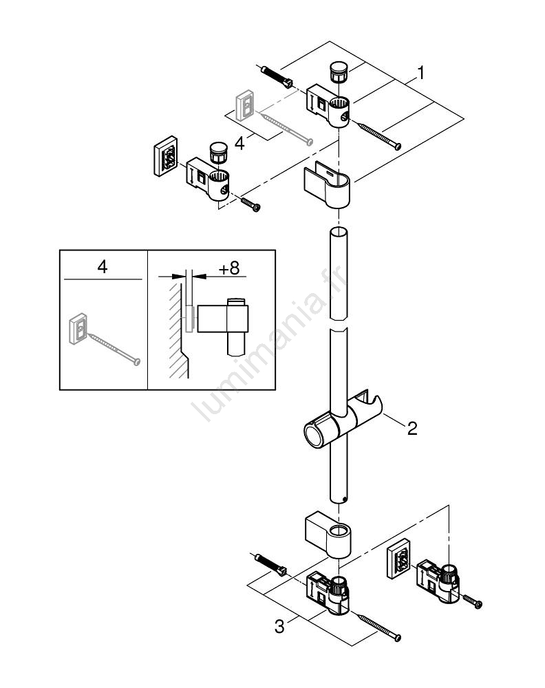 • Possibilité d'installation par perçage (vis et chevilles fournies) ou par collage (la colle GROHE QuickGlue S 41 247 000 est vendue séparément; 2 unités requises).