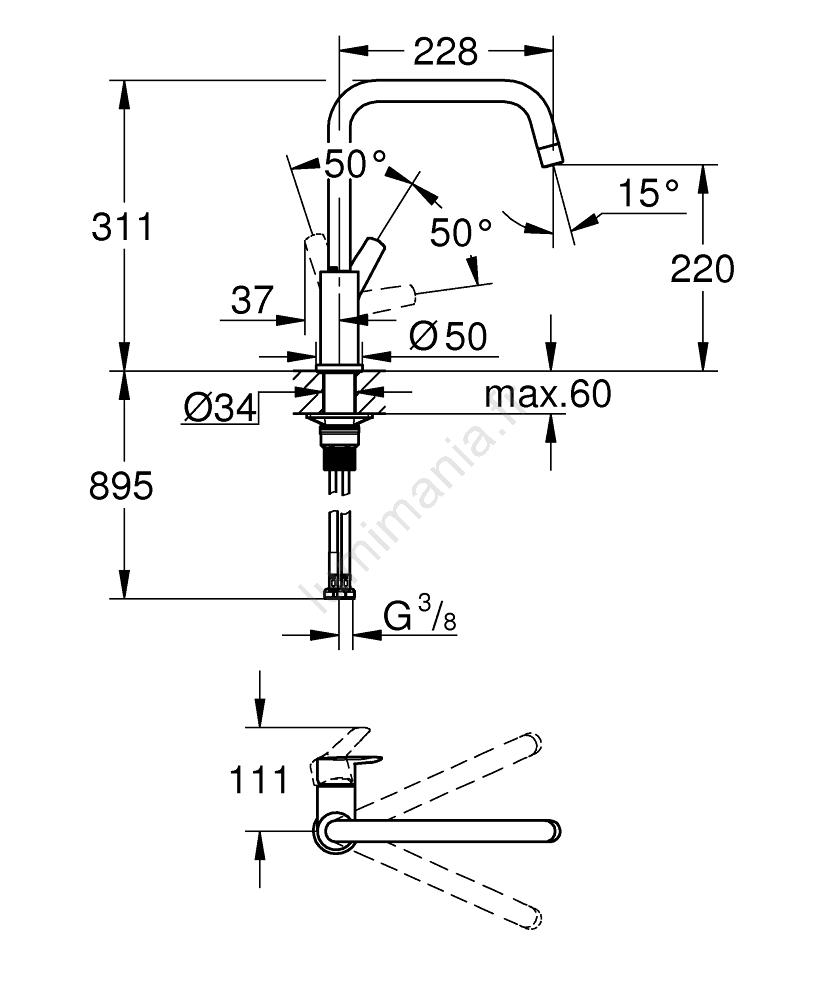 • Hauteur du robinet 311 mm et longueur du bec 228 mm pour une utilisation confortable.