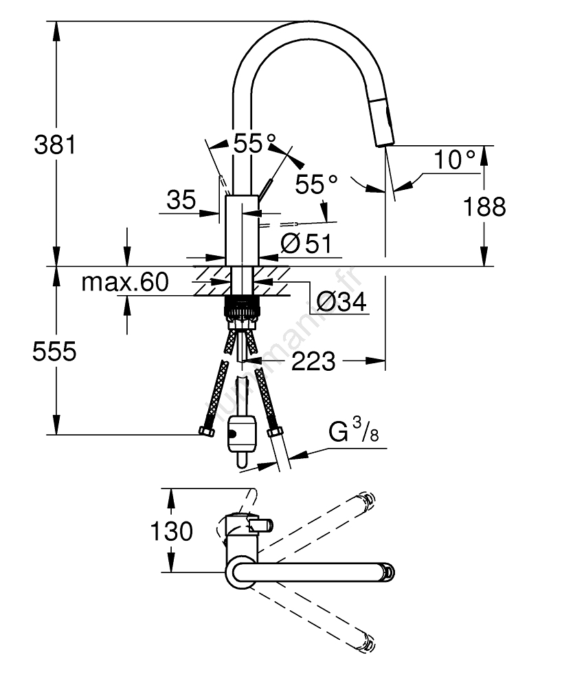 • Douchette extractible à double jet pour une flexibilité maximale lors du lavage.