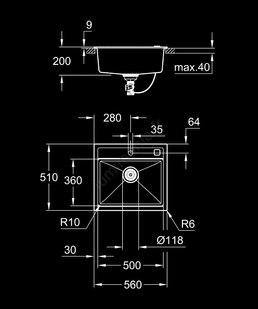 • Dimensions totales de l'évier : 560 x 510 mm.
