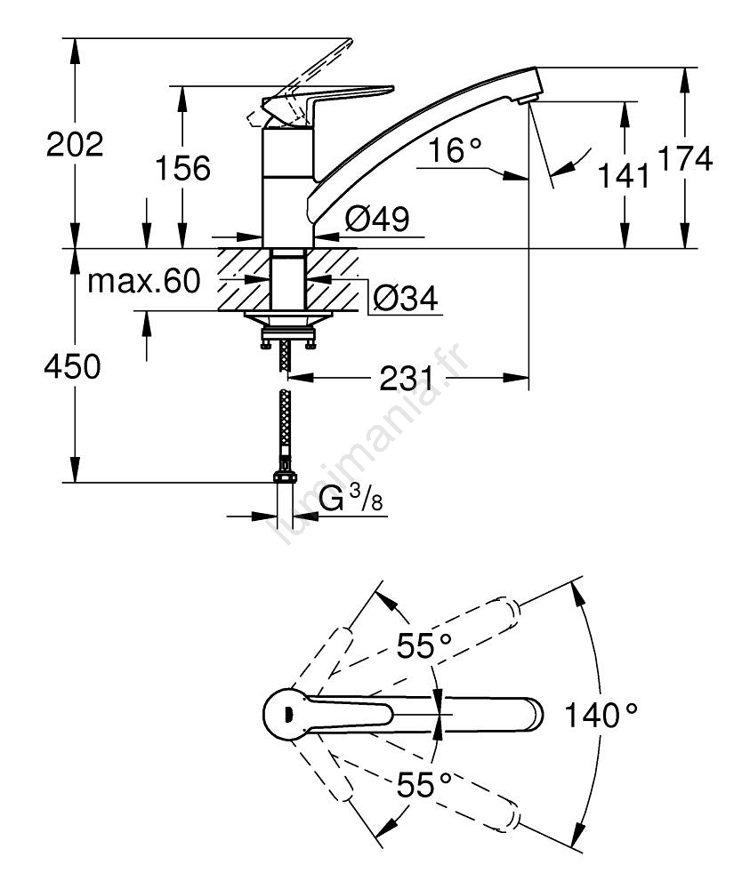 • Un angle de rotation du bec de 140° facilite les gestes lors du lavage de la vaisselle.