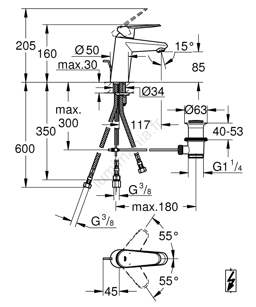 • Hauteur du mitigeur 205 mm et longueur du bec 117 mm pour un usage confortable.