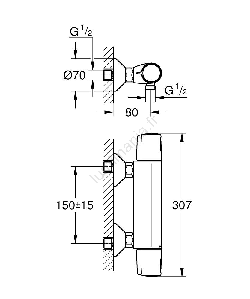 • Mitigeur thermostatique mural pour douche garantissant un réglage précis de la température de l'eau.
