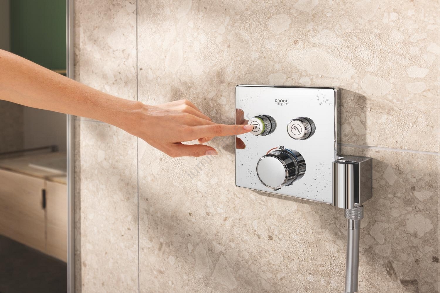 • La commande GROHE SmartControl permet de régler facilement le débit et la température de l'eau d'une simple pression et rotation du bouton.