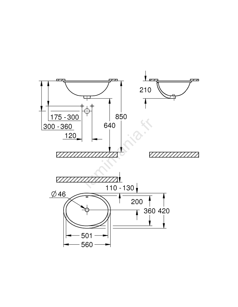 • Lavabo encastré de largeur 560 mm et de profondeur 420 mm pour une intégration élégante dans le mobilier de salle de bains.