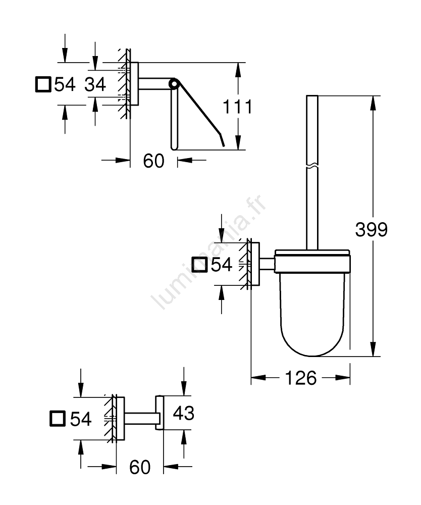 • Ensemble comprenant un crochet pour peignoir, un porte-rouleau pour papier toilette et une brosse WC pour un équipement complet des toilettes.