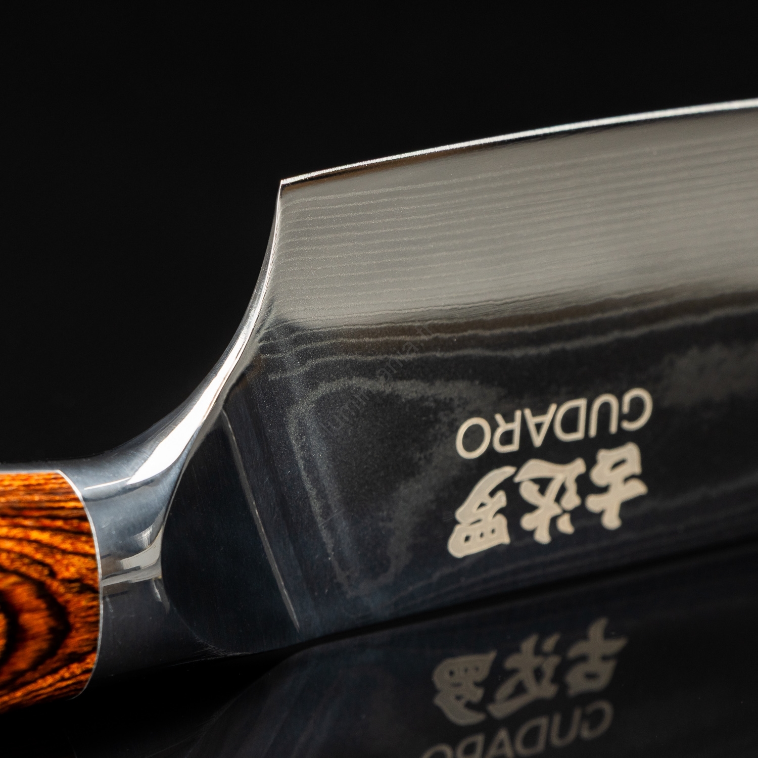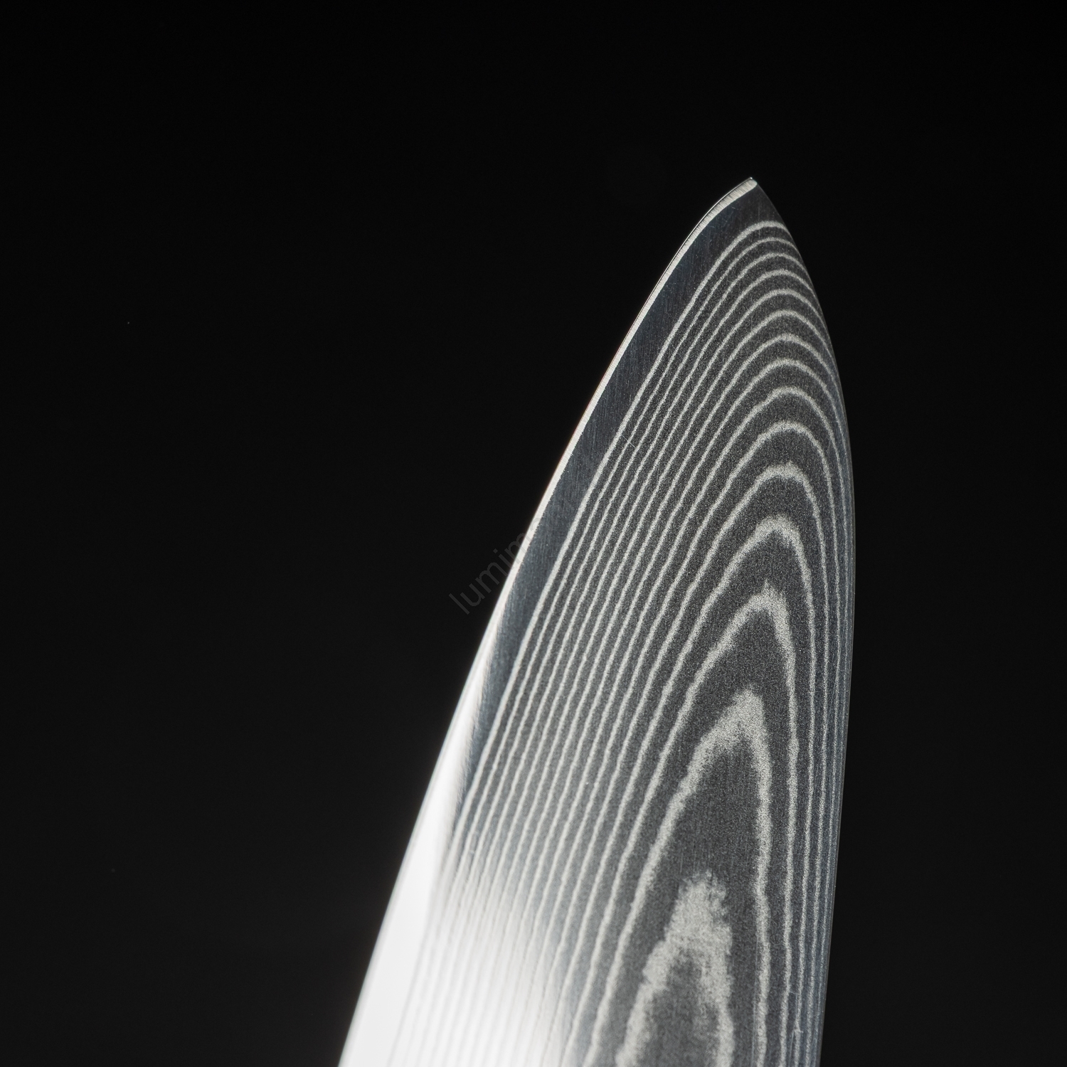 • La lame de 200 mm est fabriquée à partir de 67 couches d'acier damassé avec un noyau en VG10 – un acier japonais haut de gamme réputé pour sa dureté exceptionnelle, sa résistance et son tranchant longue durée.