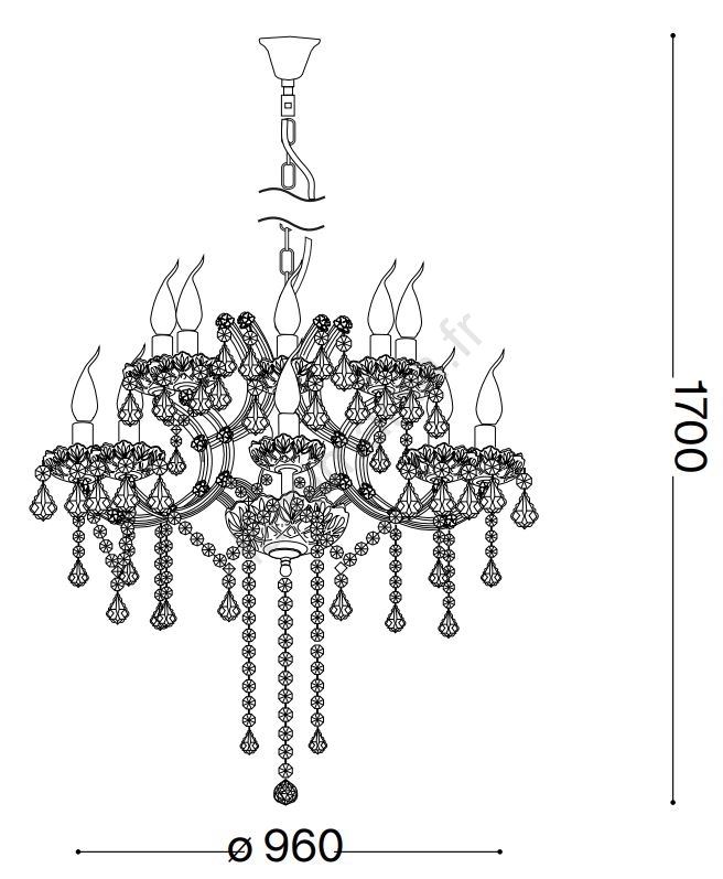 • La structure métallique avec des bras en verre soufflé est décorée de pendentifs et de chaînes en cristal taillé.