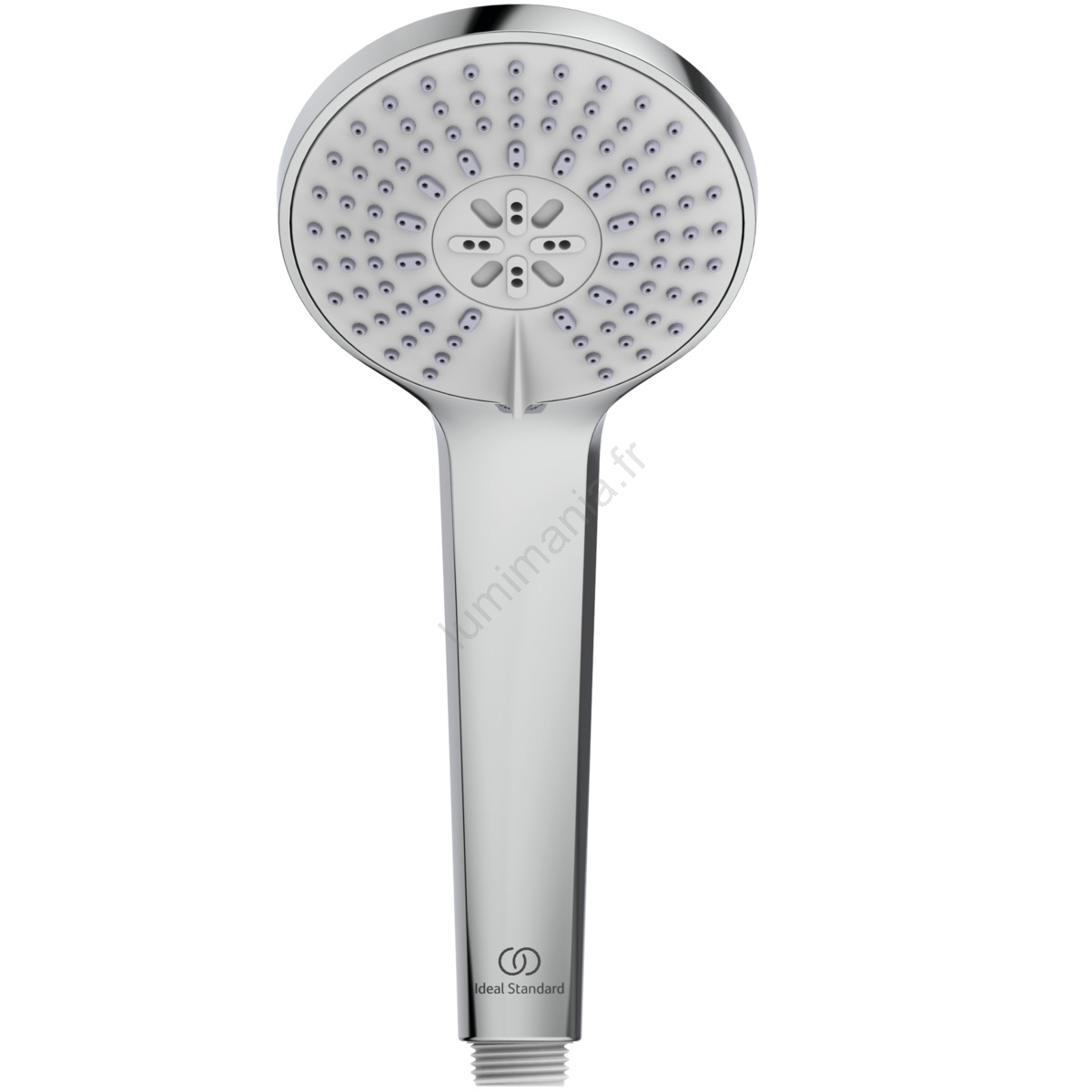 • La douchette Idealrain de 100 mm propose trois jets (Rain, Fine Rain, Massage), un limiteur de débit à 8 l/min et la technologie Anti-kalk pour un entretien facile.