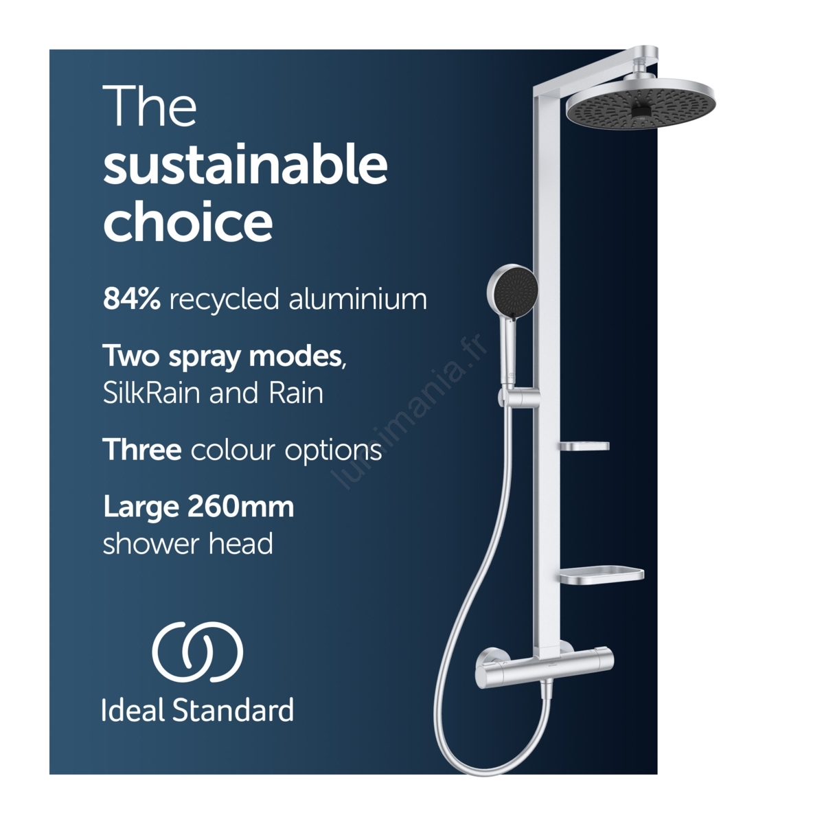 • L'ensemble comprend une barre de douche de 1113 mm avec support coulissant, deux étagères réglables en hauteur et un flexible IdealFlex de 1750 mm.