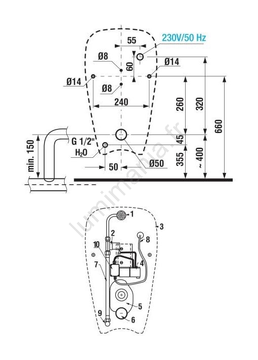 • Avec alimentation interne et évacuation arrière pour une installation propre avec les conduits dissimulés dans le mur.