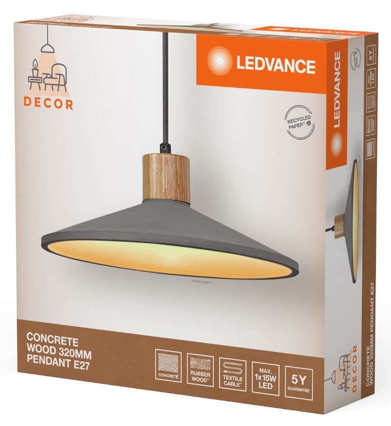Ledvance - Suspension filaire DECOR CONCRETE 1xE27/15W/230V d. 32 cm béton gris caractérise un design agréable et fonctionnel.  Une ampoule à culot E27 convient pour ce luminaire. Ici, vous pouvez acheter d'autres ampoules à des prix avantageux. Vous aurez un ajout intéressant dans votre intérieur.