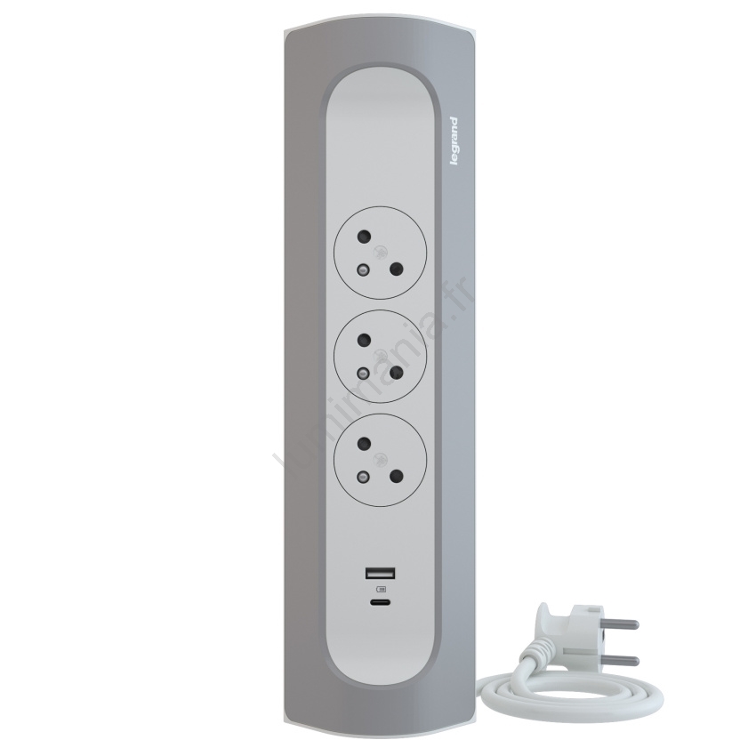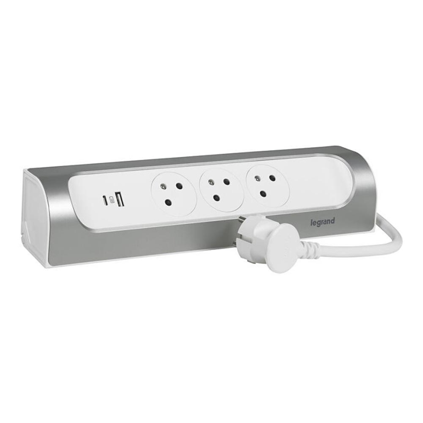 Legrand 049406 - Rallonge 3 prises Type E + USB-A + USB-C, 1 m, argenté/blanc