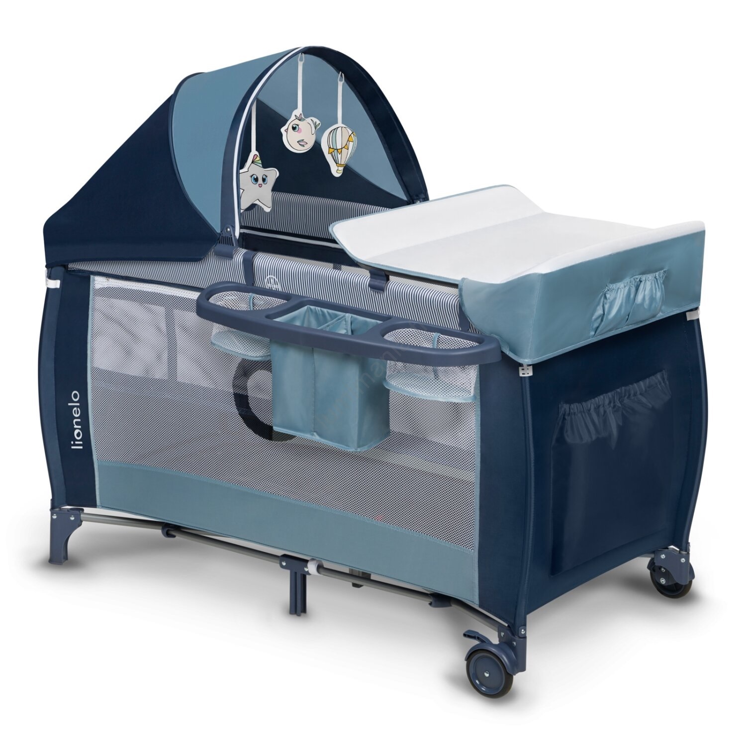 • Inclus dans l'emballage : table à langer avec poches latérales (pour couches, poudre, etc.), panier de rangement à deux compartiments, grande moustiquaire, capote et arche avec peluches.