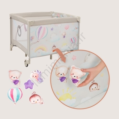 • Comprend un tapis intégré imprimé d'animaux colorés et des jouets fixés par scratch, qui stimulent la curiosité et développent l'imagination ainsi que la motricité de l'enfant.