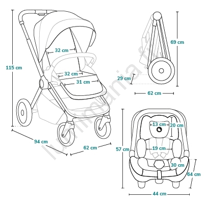 • Nacelle spacieuse, pliable, hauteur réglable via adaptateurs, housse ouvrable des deux côtés.
