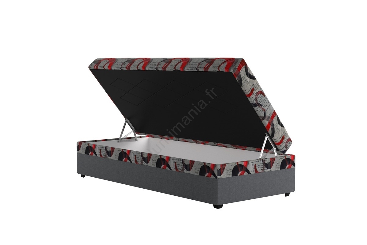 • Le lit coffre possède un noyau PxJx composé de mousses de polyuréthane (dites mousses PUR), posé sur un cadre à lattes et tapissé conjointement.