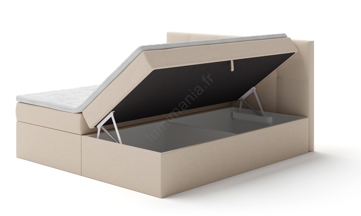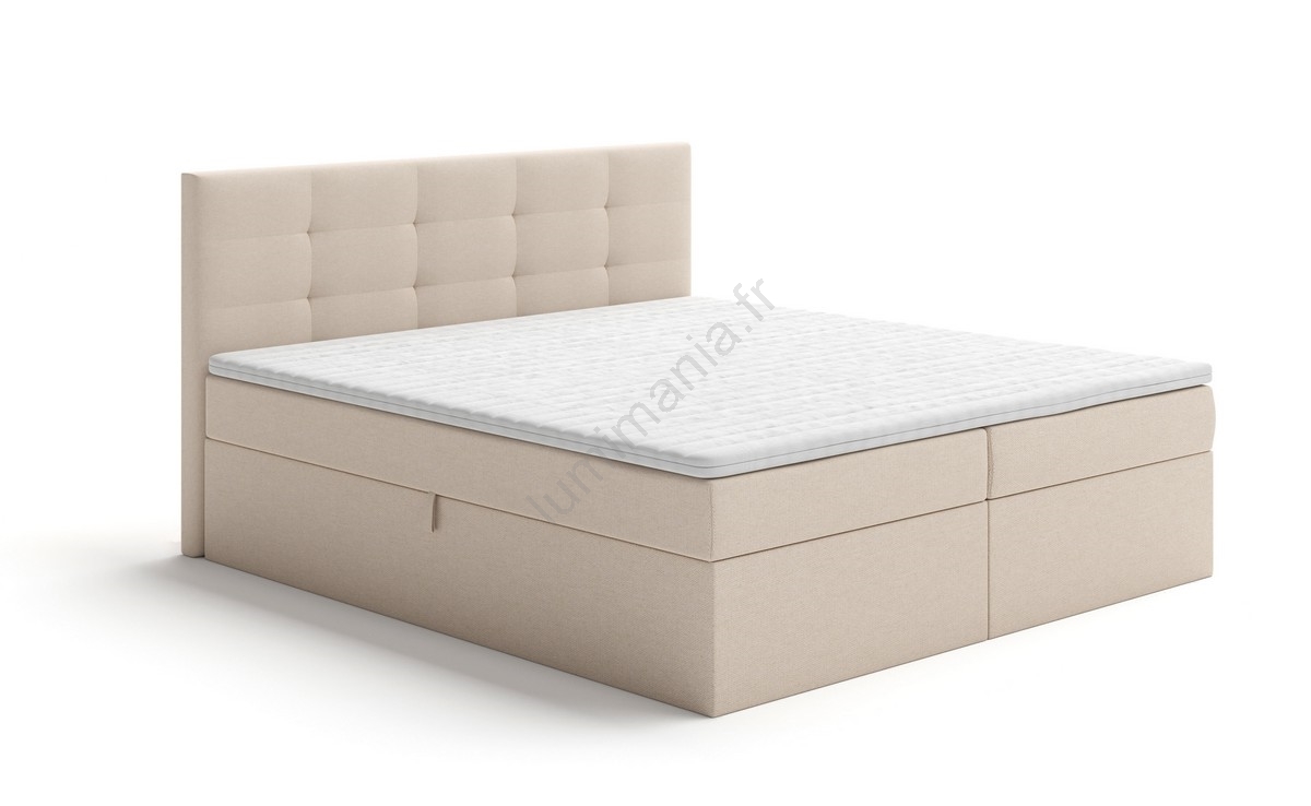 Lit tapissé EMBER 180x200 cm avec matelas et surmatelas, muni d'un coffre de rangement, beige