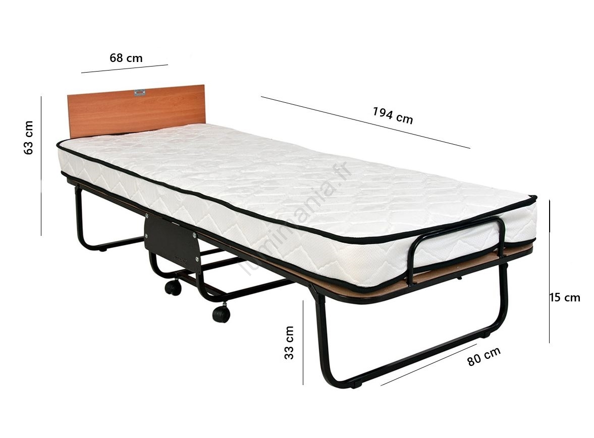 • Le lit pliant est équipé d'une tête de lit et d'un matelas à ressorts de 15 cm, offrant un confort optimal pour un sommeil réparateur.