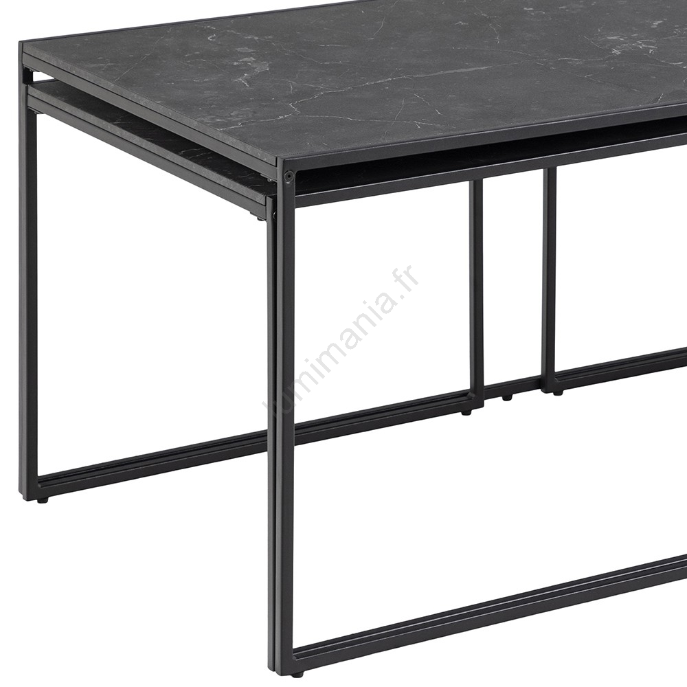 • Grâce à ses lignes épurées, son aspect marbre et son laquage noir poudré, cet ensemble de tables basses convient à presque tous les salons.