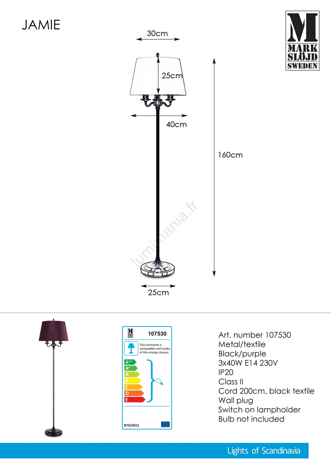 Markslöjd 107530 - Lampadaire JAMIE 3xE14/40W/230V caractérise un design agréable et fonctionnel.  Une ampoule à culot E27 convient pour ce luminaire. Ici, vous pouvez acheter d'autres ampoules à des prix avantageux. Vous aurez un ajout intéressant dans votre intérieur.