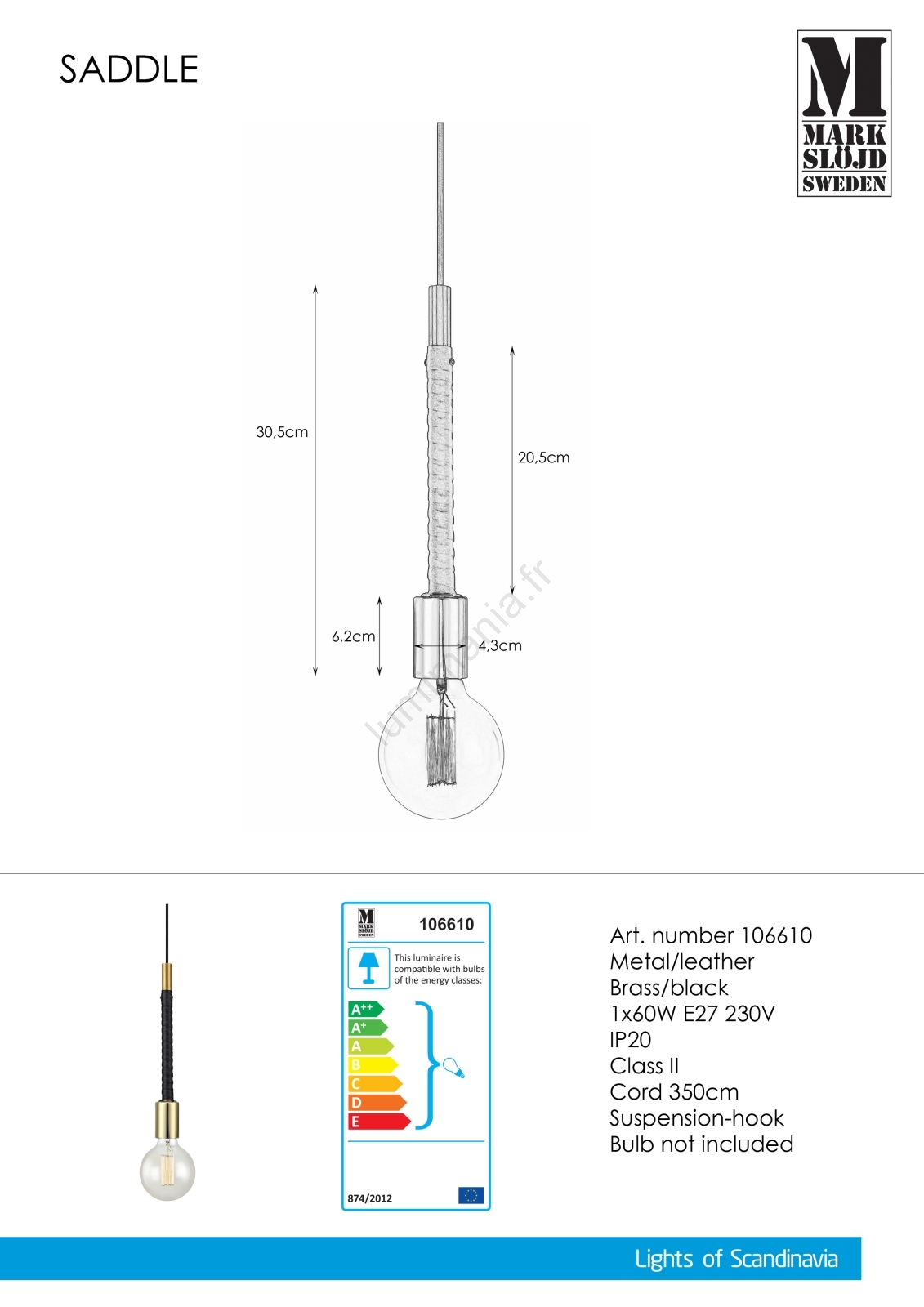 Markslöjd 106610 - Suspension avec fil SEDLO 1xE27/60W/230V caractérise un design agréable et fonctionnel.  Une ampoule à culot E27 convient pour ce luminaire. Ici, vous pouvez acheter d'autres ampoules à des prix avantageux. Vous aurez un ajout intéressant dans votre intérieur.