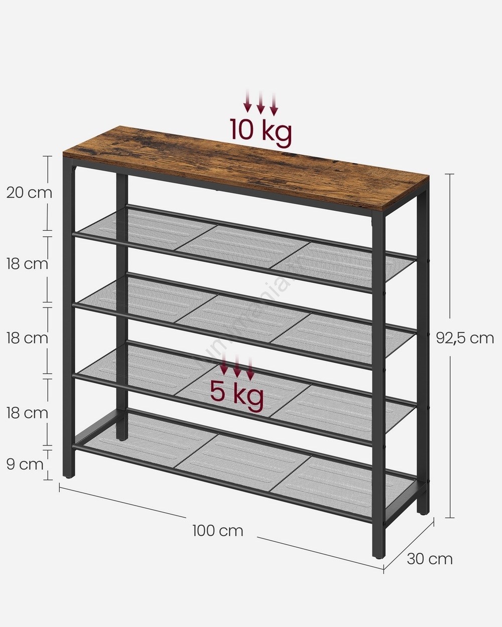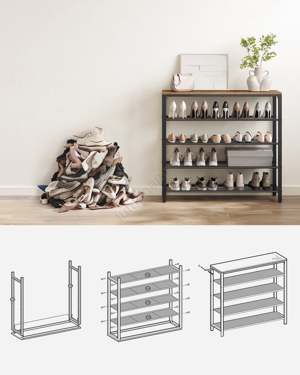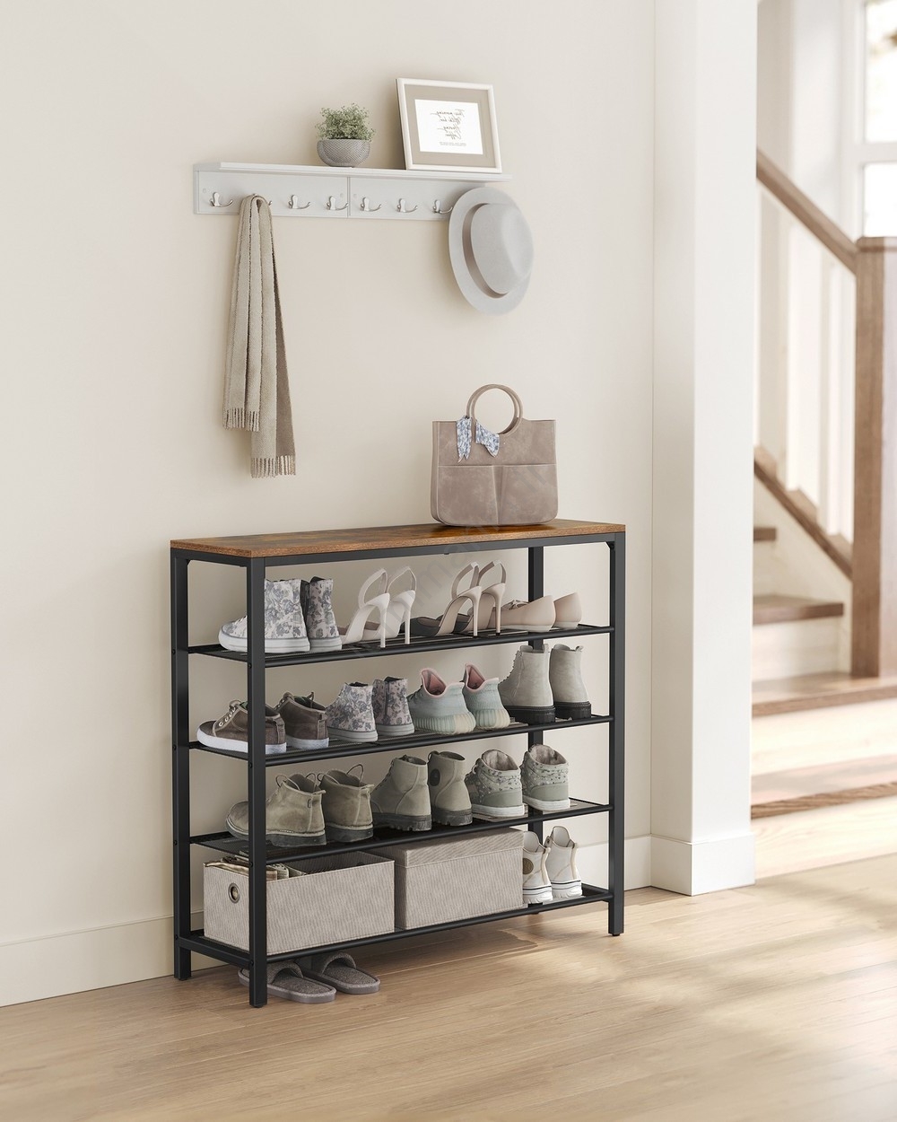 • Avec une capacité de charge de 10 kg sur le plateau supérieur et de 5 kg maximum par étagère, ce rangement accueille en toute sécurité vos chaussures, sacs et objets décoratifs.