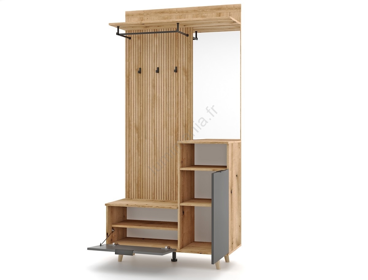• Une étagère ouverte, des crochets, une barre porte-manteaux et un grand miroir offrent exactement ce dont vous avez besoin.