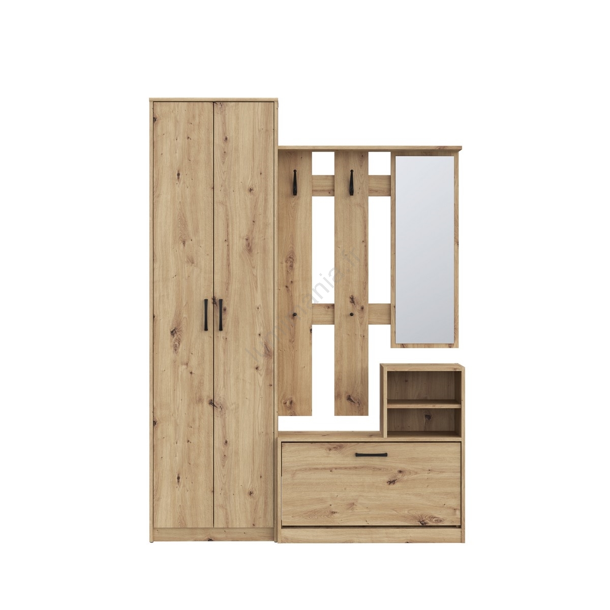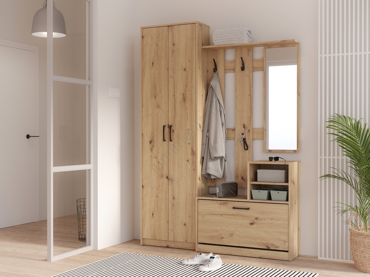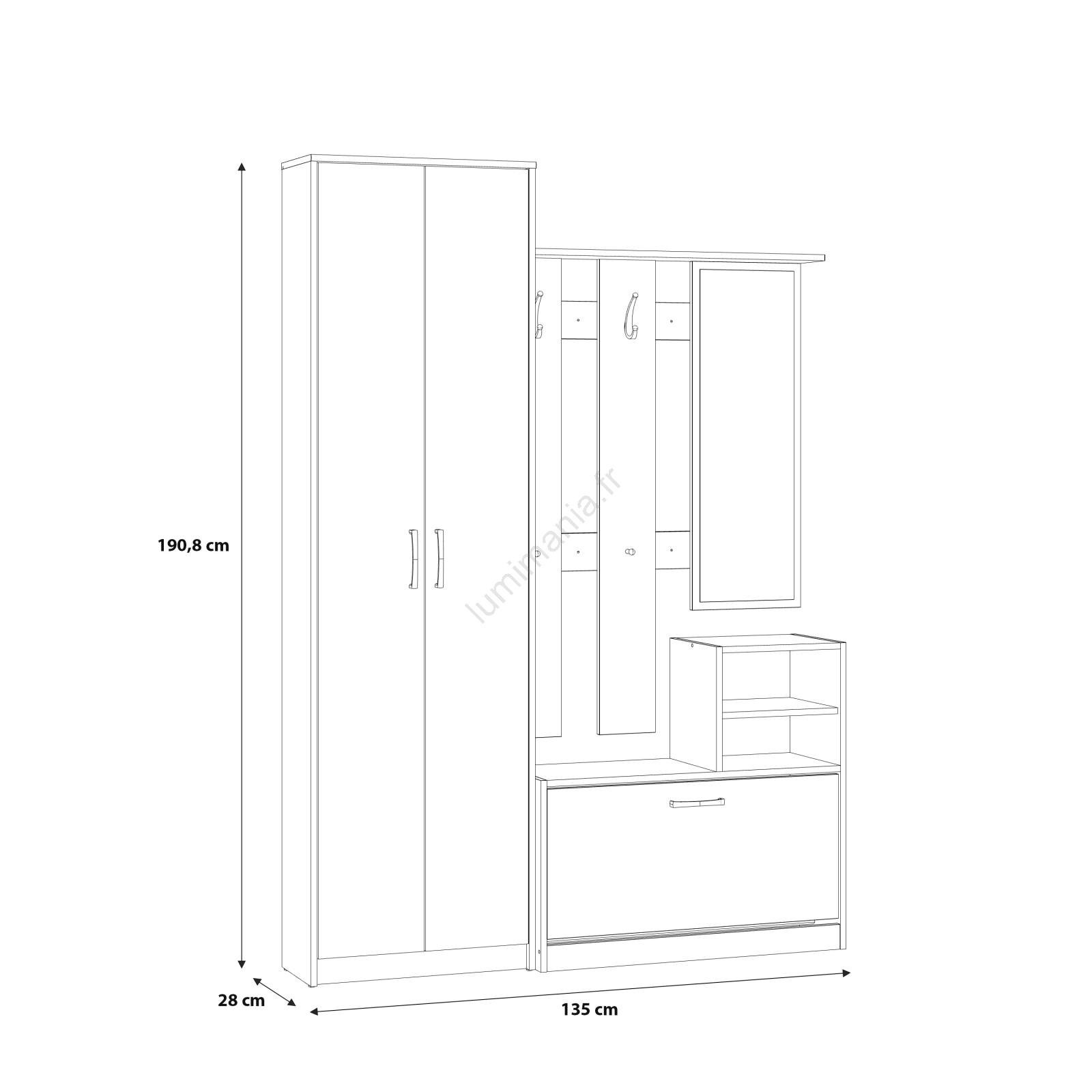 • Armoire, étagères, meuble à chaussures, crochets et grand miroir offrent exactement ce dont vous avez besoin.