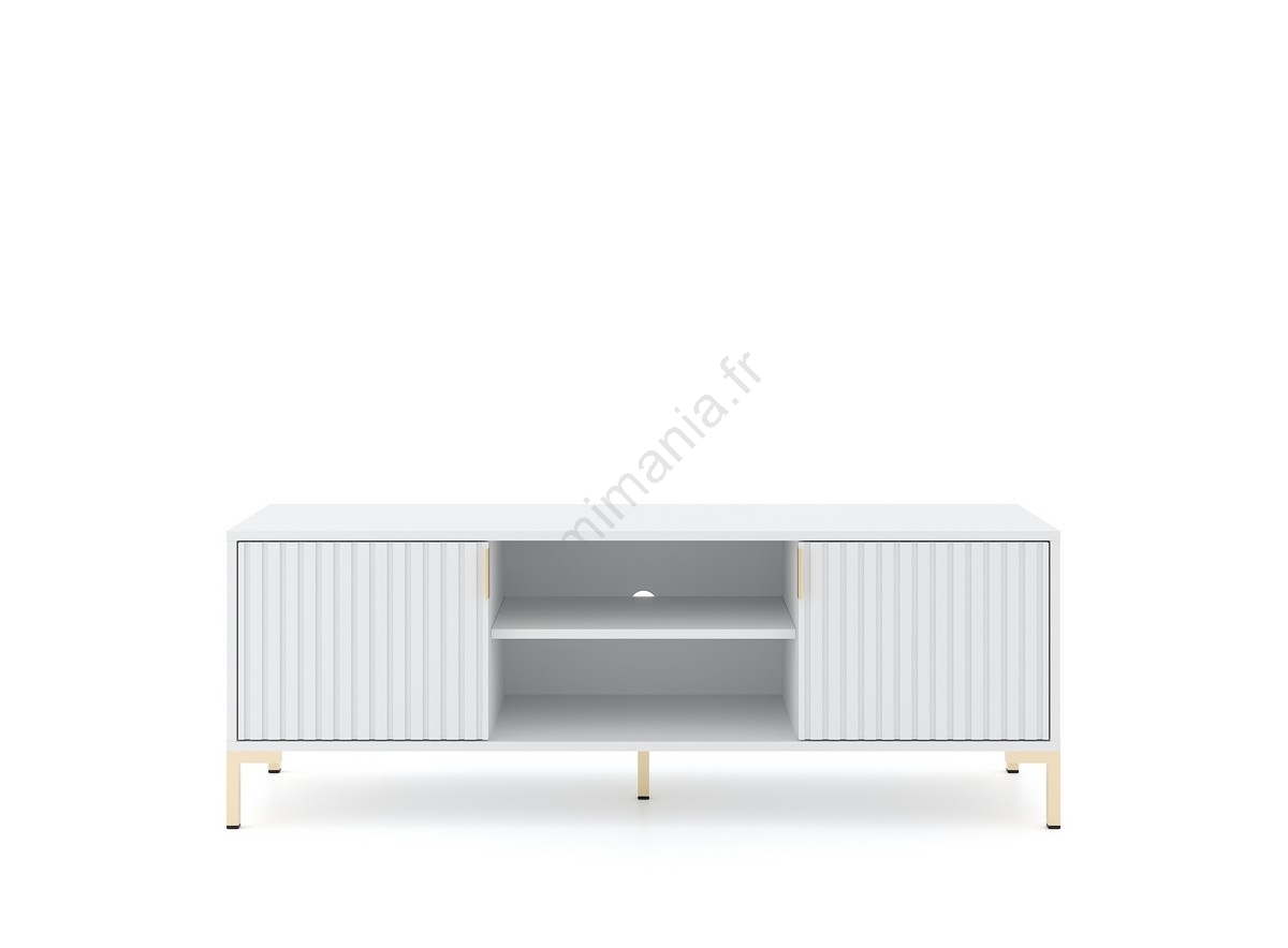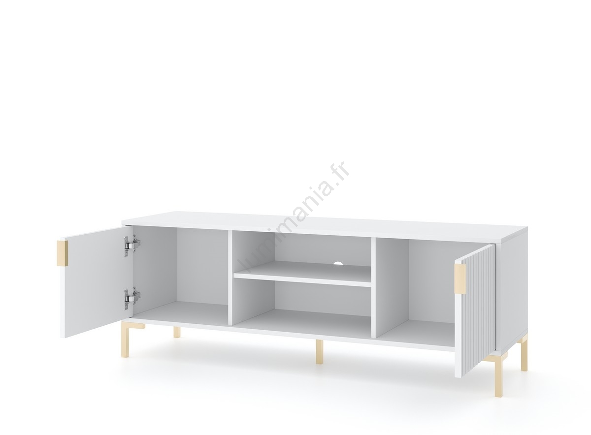 • Il comporte deux compartiments latéraux fermés, chacun doté d'une porte avec poignées symétriques et d'un décor à rainures, ainsi que deux étagères ouvertes avec un passage pour câble au centre.