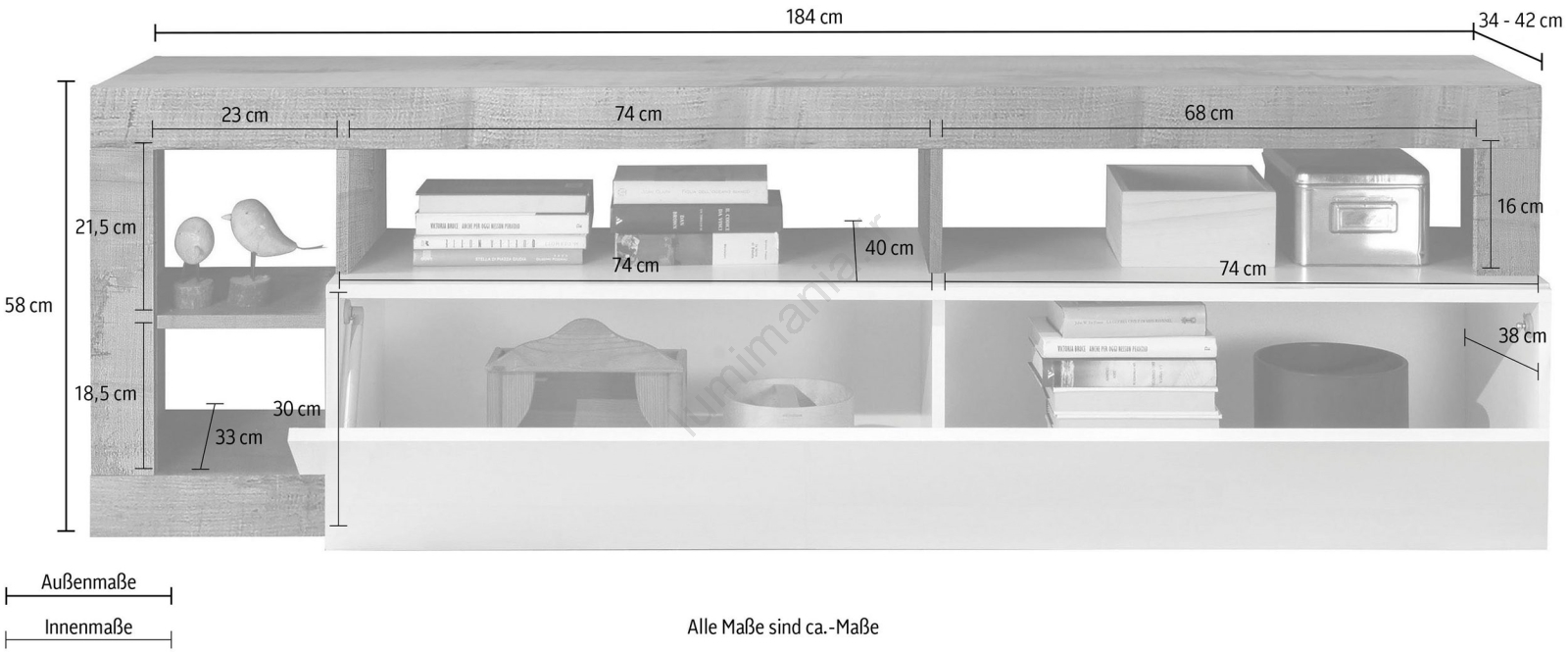 • Compartiment inférieur et les étagères ouvertes offrent de l'espace pour des livres, des décorations et des articles ménagers.