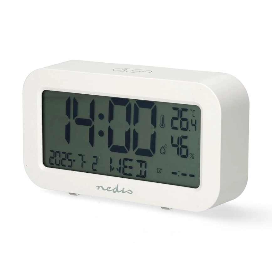 Horloge numérique avec alarme, thermomètre et hygromètre — fonctionne avec 2 piles AA — blanc