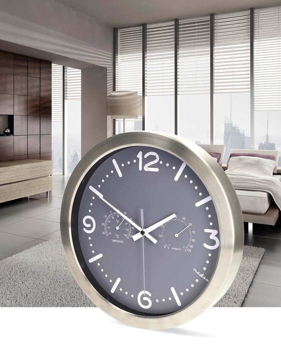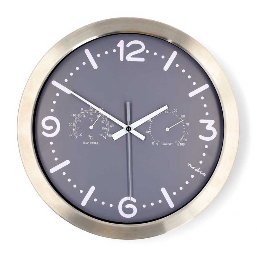 Horloge murale avec thermomètre et hygromètre Ø 30,5 cm, fonctionne avec 1 pile AA, boîtier inox/gris