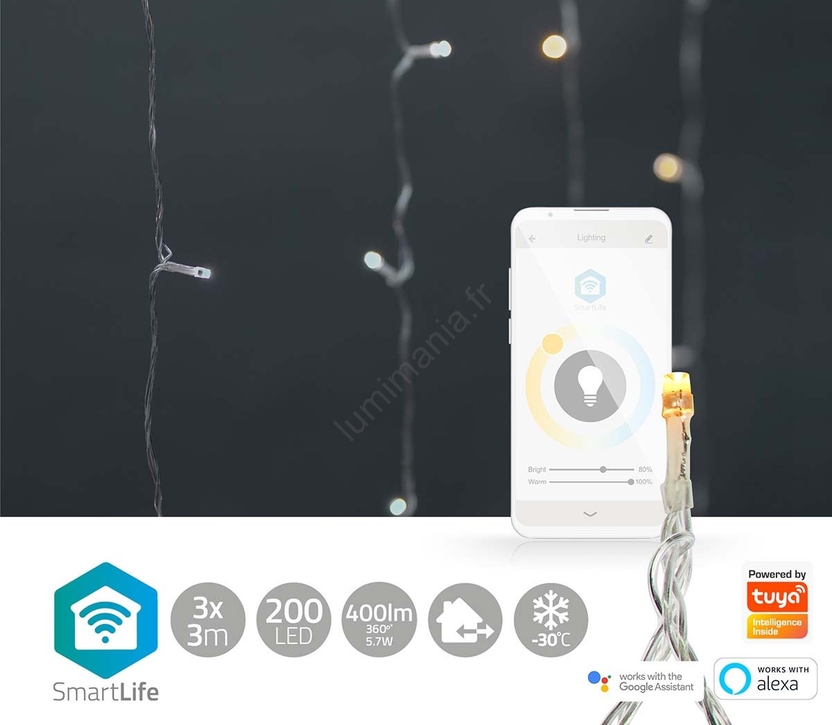 Rideau lumineux de Noël LED 200 LED / 11 fonctions, 6 m, IP65, Wi‑Fi Tuya, du blanc chaud au blanc froid