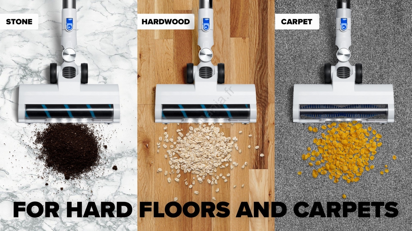 • Il aspire facilement non seulement tous les sols durs comme le parquet, le PVC, le linoléum, mais aussi les tapis et les couloirs.