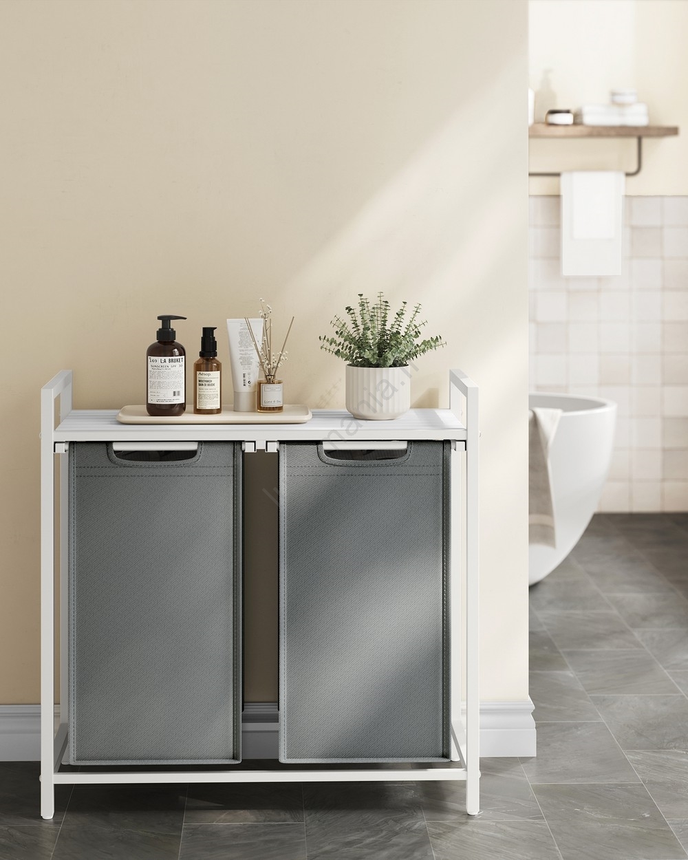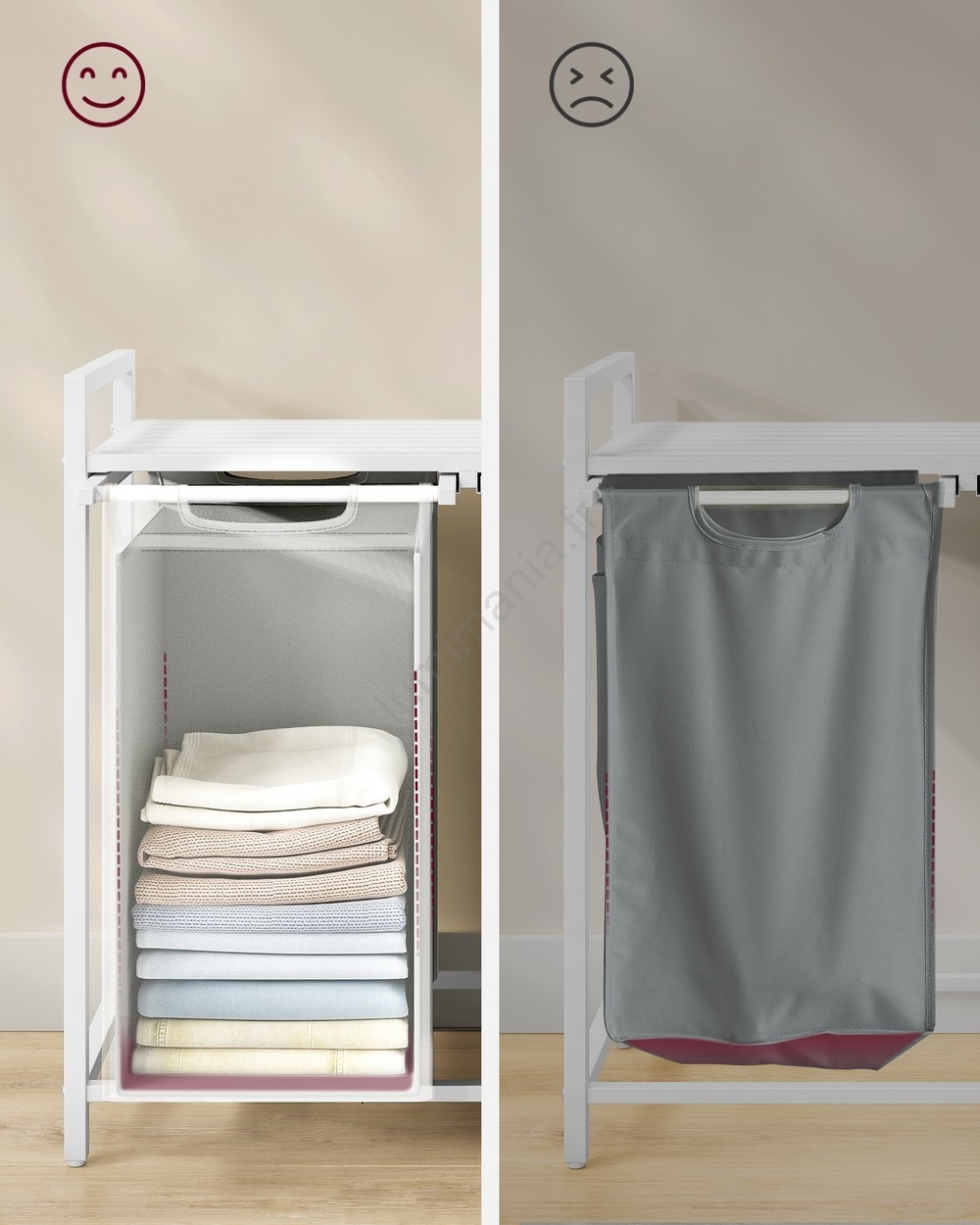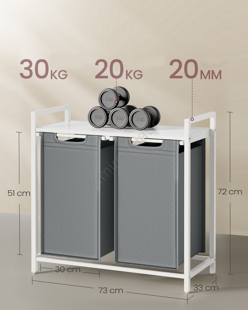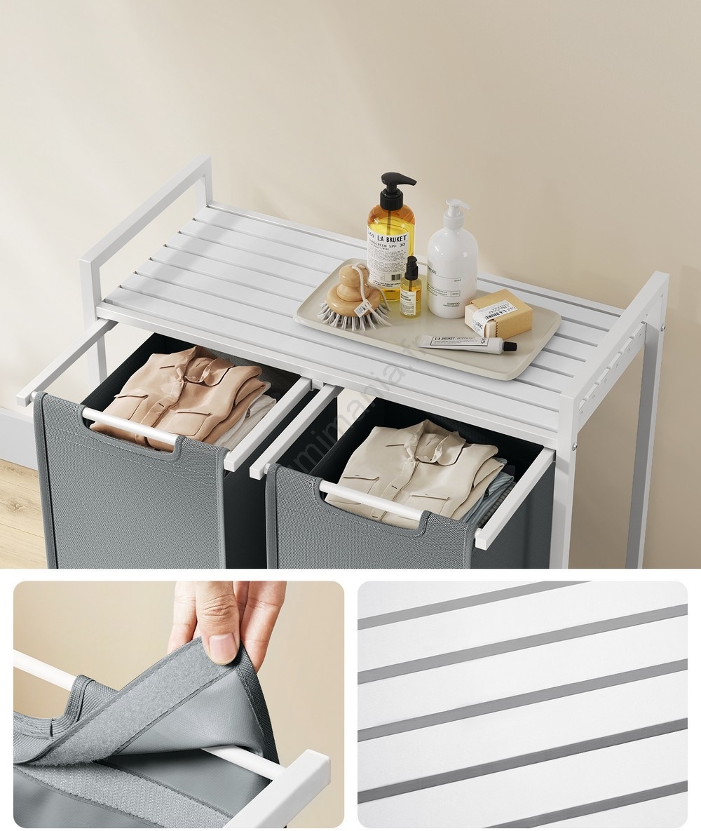• 2 sacs, 1 étagère – Triez votre linge dans deux sacs en tissu (46 L par sac) et rangez lessive, assouplissant et autres produits sur l'étagère.