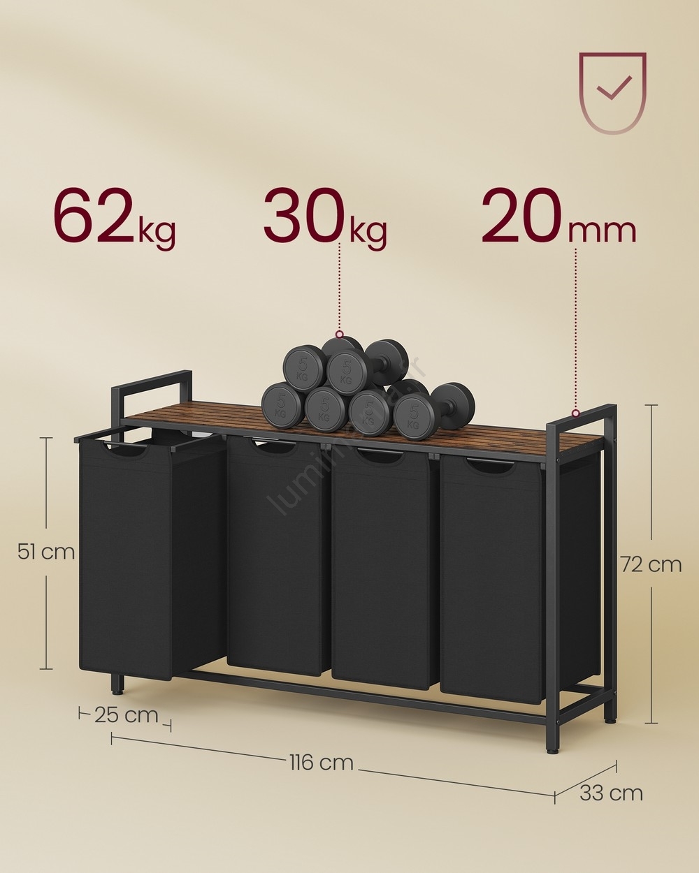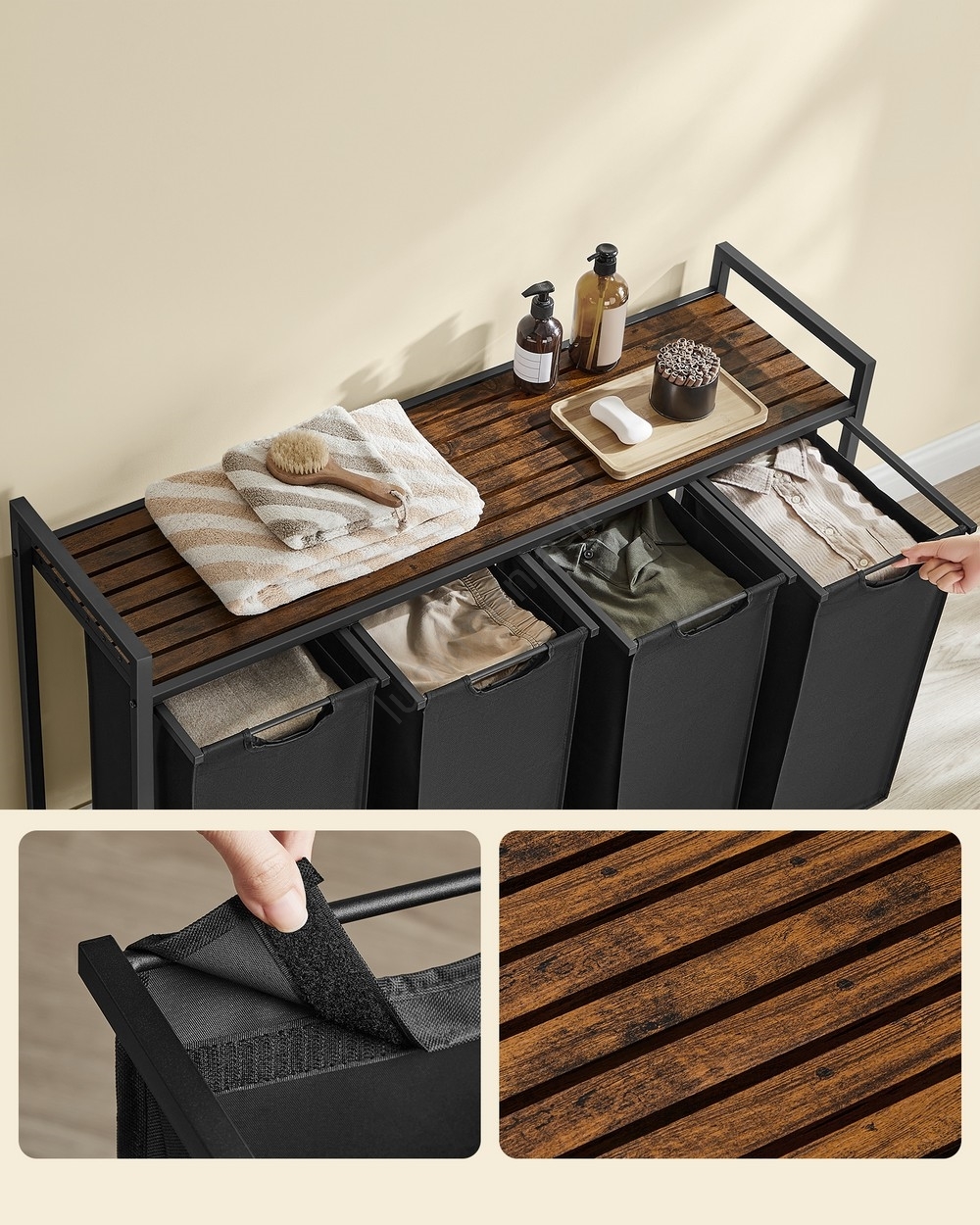 • 4 sacs, 1 étagère – Triez votre linge dans quatre sacs en tissu (40 l par sac) et rangez lessive, adoucissant et autres produits sur l'étagère.