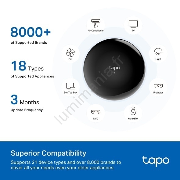 • Tapo H110 est un hub infrarouge et IoT intelligent qui remplace de nombreuses télécommandes et centralise le contrôle des appareils domestiques au sein d'une seule application.