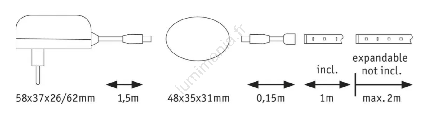 • Kit complet comprenant le ruban adhésif et l'alimentation électrique.