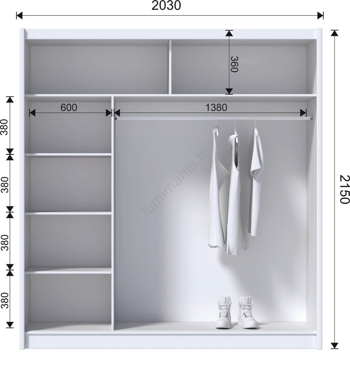 • L'armoire dispose de 4 étagères ouvertes, d'une tringle pour vêtements et de 2 étagères supérieures pour ranger sacs et articles saisonniers.
