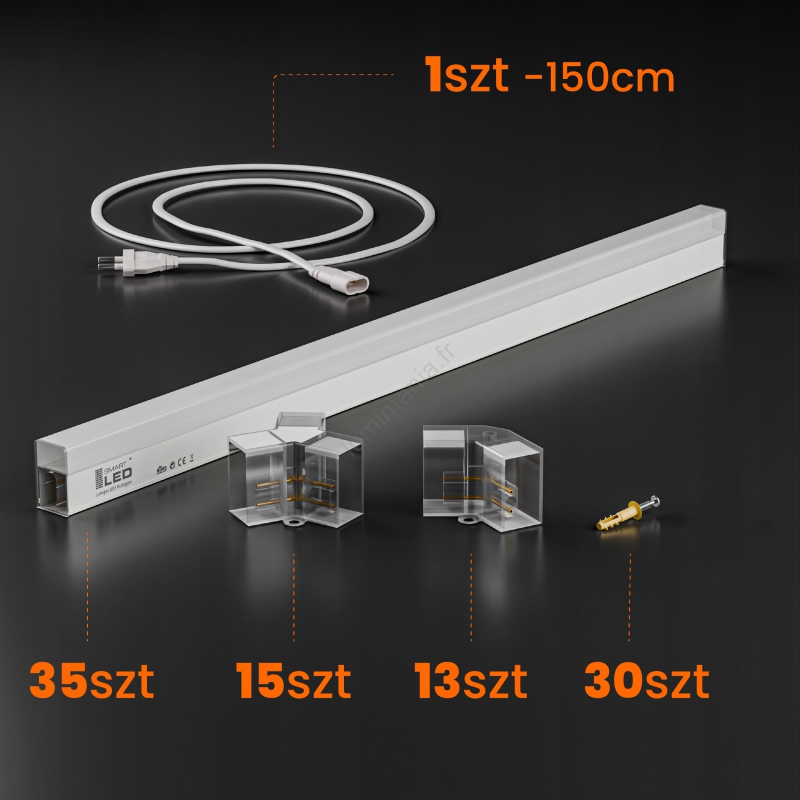 • Contenu de l'emballage : câble d'alimentation (150 cm), 35 panneaux LED, 15 connecteurs triples, 13 raccords d'angle, 30 chevilles + vis, accessoires de montage (œillets en plastique ou supports métalliques selon l'option).