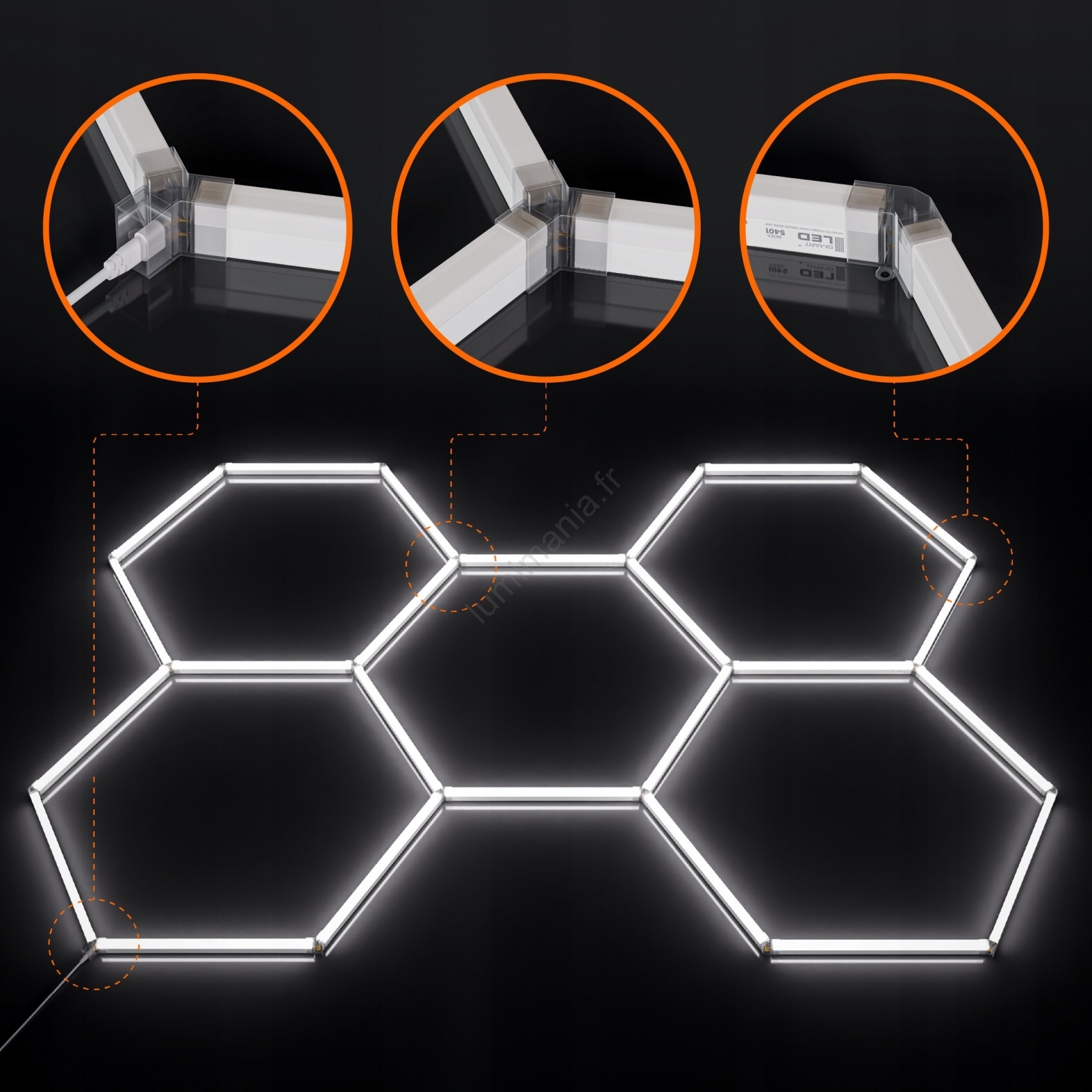 • Contenu de l’emballage : câble d’alimentation (150 cm), 24 panneaux LED, 9 connecteurs triples, 11 connecteurs d’angle, 30 chevilles + vis, accessoires de montage (œillets en plastique ou consoles métalliques selon le choix).