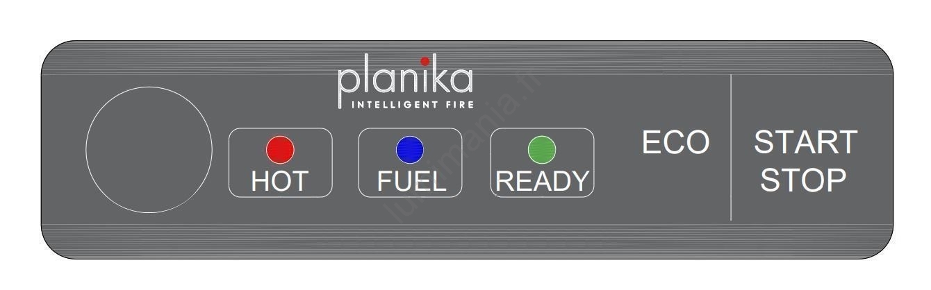 • Le panneau de commande vous permet d'allumer et d'éteindre le foyer manuellement, de passer en mode ECO et d'indiquer si le réservoir est vide, si le foyer est prêt à être allumé et s'il est surchauffé.
