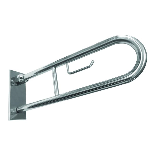 • Barre d'appui rabattable avec porte-rouleau de papier toilette intégré pour un gain d'espace maximal.