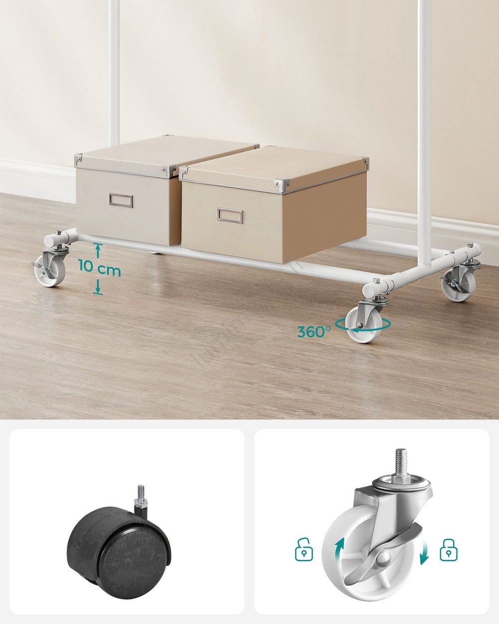 • 4 roulettes robustes en PP pivotantes à 360° (2 freins) facilitent le déplacement ou le maintien immobile du portant.