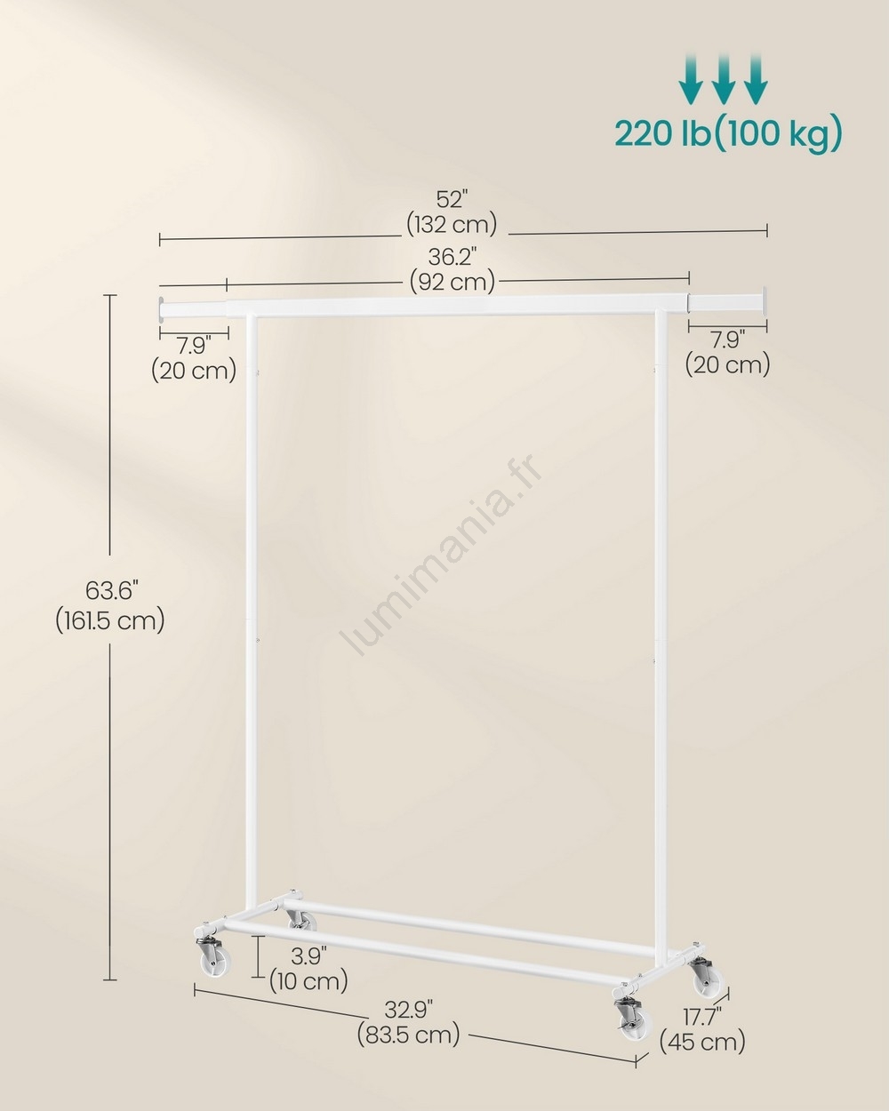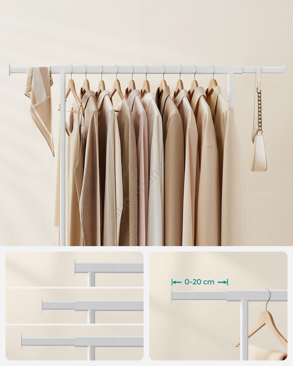• La barre supérieure supporte jusqu'à 100 kg (répartition uniforme) sans vacillement ni basculement ; la barre télescopique offre un espace supplémentaire pour vos vêtements, chapeaux, sacs, etc.