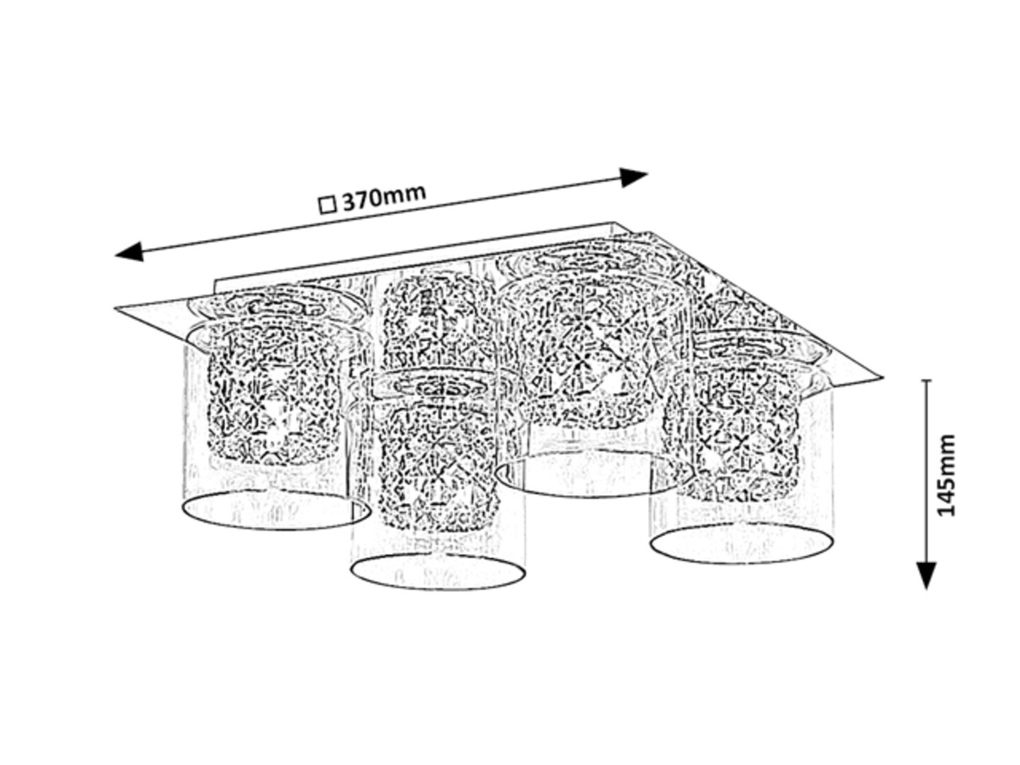 Le plafonnier moderne et élégant Duchess à 4 ampoules sera un ajout spectaculaire à l’aménagement de votre salon, salle à manger ou chambre à coucher. Ce luminaire en métal chromé est agrémenté d’abat-jours cylindriques en verre transparent, qui laissent apparaître une magnifique décoration en cristal à l’intérieur des têtes du luminaire. Ce modèle se fixe au plafond grâce à une grande base décorative carrée. Le luminaire Duchess peut être équipé de quatre ampoules, chacune d’une puissance maximale de 40W. Le type de culot est G9. Selon vos préférences, vous pouvez choisir pour ce modèle une source lumineuse à lumière blanche chaude ou naturelle. Si vous installez ce luminaire dans une chambre, nous vous recommandons d’utiliser des ampoules diffusant une lumière blanche chaude, qui vous aideront à créer une ambiance chaleureuse et intime. Les dimensions du plafonnier Duchess sont de 370x370 mm, avec une distance au plafond de 145 mm. Ce modèle est livré sans sources lumineuses.