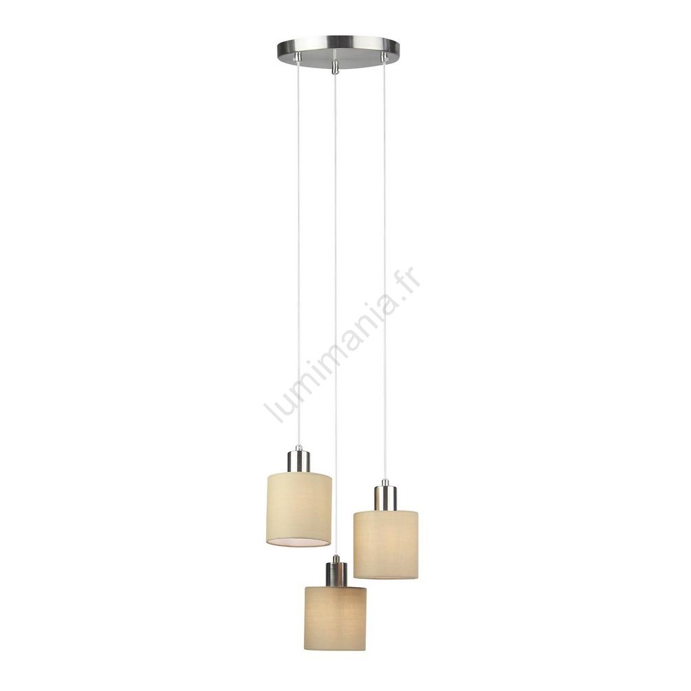 Le luminaire suspendu triple Natina se distingue par son design moderne et discret ainsi que par ses couleurs élégantes. Le corps métallique du luminaire, réalisé dans une combinaison de couleurs chromée satinée marron, est complété par des abat-jours cylindriques en textile et un socle décoratif en métal. La largeur du luminaire suspendu triple est de 330 mm, le diamètre du socle décoratif rond est de 220 mm et sa distance par rapport au mur est de 1170 mm. Grâce à ses trois abat-jours suspendus à différentes hauteurs, ce luminaire suspendu constitue une solution véritablement spectaculaire pour éclairer votre salon ou votre salle à manger moderne. Le luminaire d’intérieur Natina peut être utilisé avec trois ampoules à économie d’énergie d’une puissance maximale de 25 W chacune. Pour renforcer une ambiance chaleureuse et intime, optez pour des ampoules diffusant une lumière blanche chaude. Le type de culot est E14. Le luminaire suspendu triple Natina est livré sans ampoules.