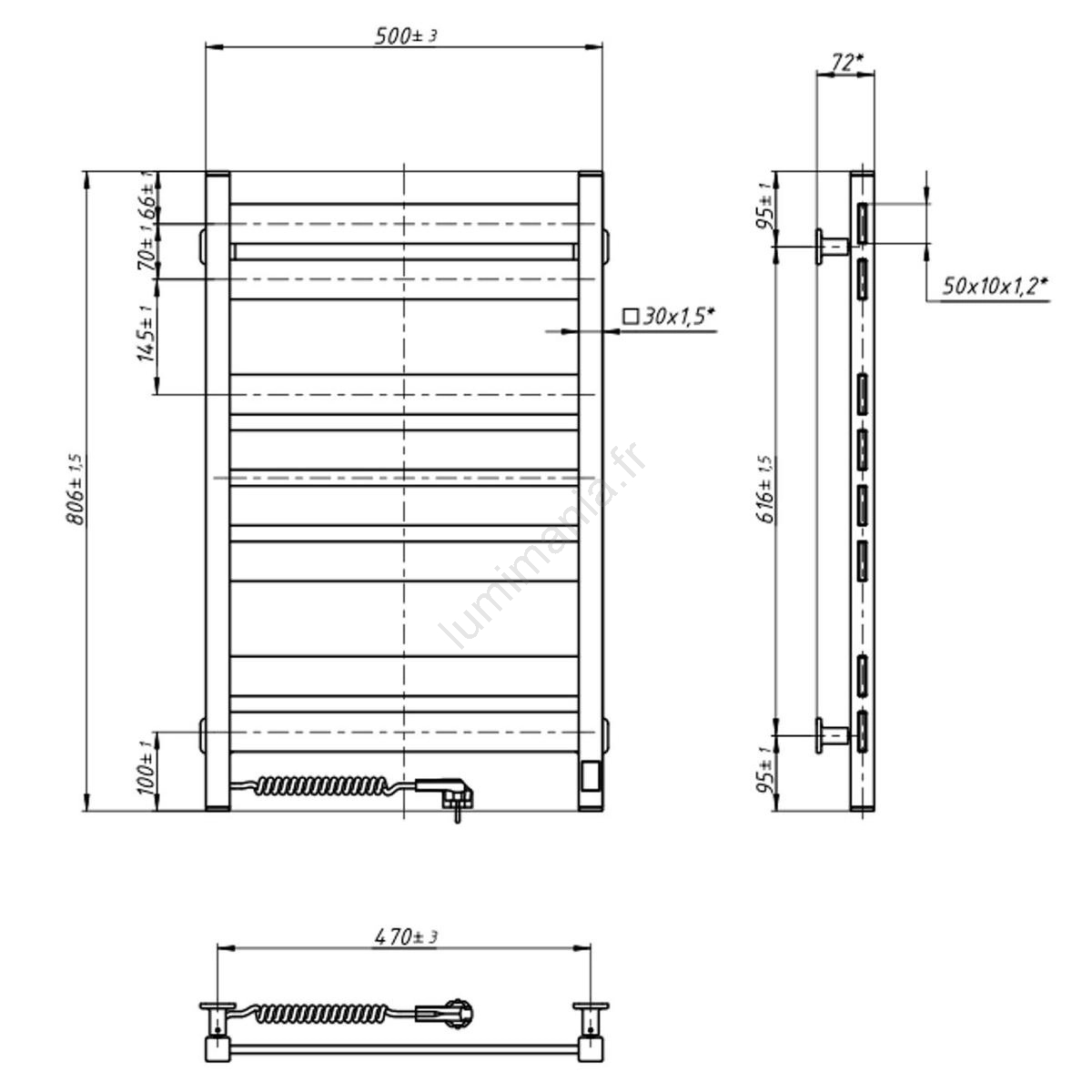 • Sèche-serviettes électrique LARGO avec thermostat 168 W, 80 × 50 cm, blanc, côté droit