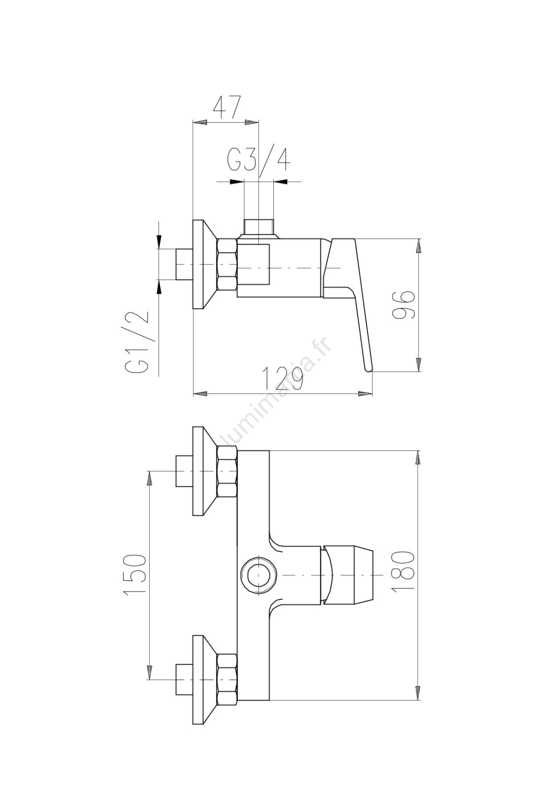 • Mitigeur de douche mural avec sortie supérieure 3/4" pour barre de douche.